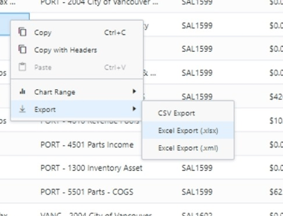 To export this General Ledger report, right-click anywhere in the report, hover over Export, and select Excel Export (.xlsx)
