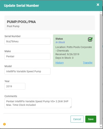 Equipment and big-ticket items such as pumps, heaters, hot tubs, chemical feeders, and more are typically given a Serial Number by the Manufacturer to track that specific unit. Having a Serial Number is useful for obtaining warranty service, ensuring you get correct replacement parts, and tracking various information as it pertains to the product. A Serial Number is a unique identifier associated with a single quantity of a product. Therefore, Serial Numbers can only be transacted as a single quantity and not in bulk.