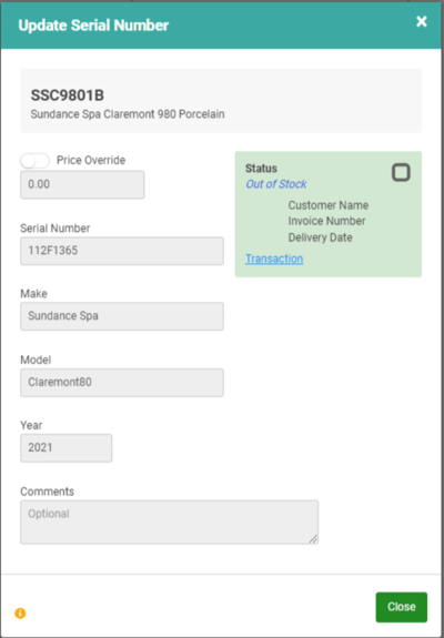IMPORTANT! If you need to make updates to Serial Numbers that are Out of Stock/Sold, you must do so through the Customer Profile / Equipment tile.