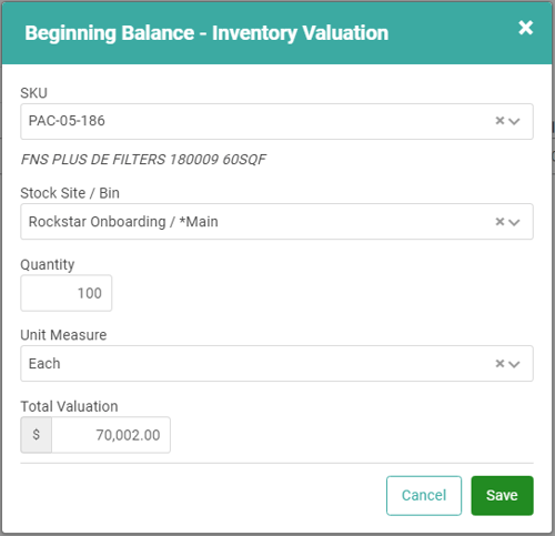 Use the dropdowns to select the SKU for which you want to create a Balance and the Stock Site/Bin location of the SKU. Enter the quantity you have on hand, select the correct (Sell By)Unit of Measure, and enter the total Value. When you’ve entered all the information, click