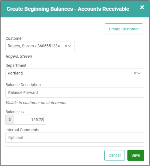 Select the Customer and Department from the dropdowns and add a Balance Description. We default the description as Balance Forward, but you can change that to whatever makes sense for you. Enter the balance. Finally, you can include optional internal comments. Click