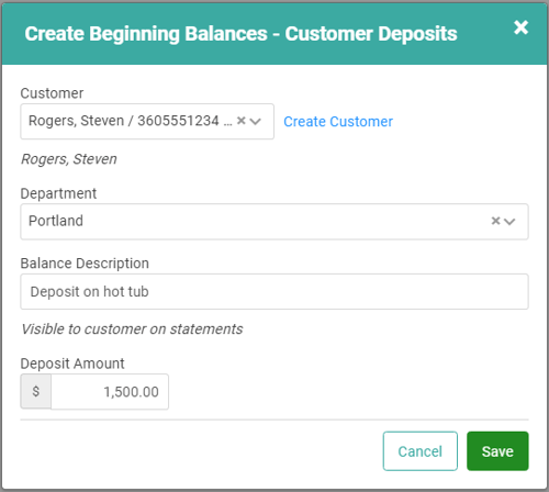 Choose the Customer and Department from the dropdowns, enter a Balance Description, and enter the amount. When you’ve entered all the information, click