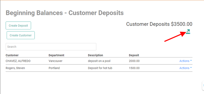 The new Deposit will display on the Beginning Balances – Customer Deposits screen. Repeat these steps for each Deposit you want to create.