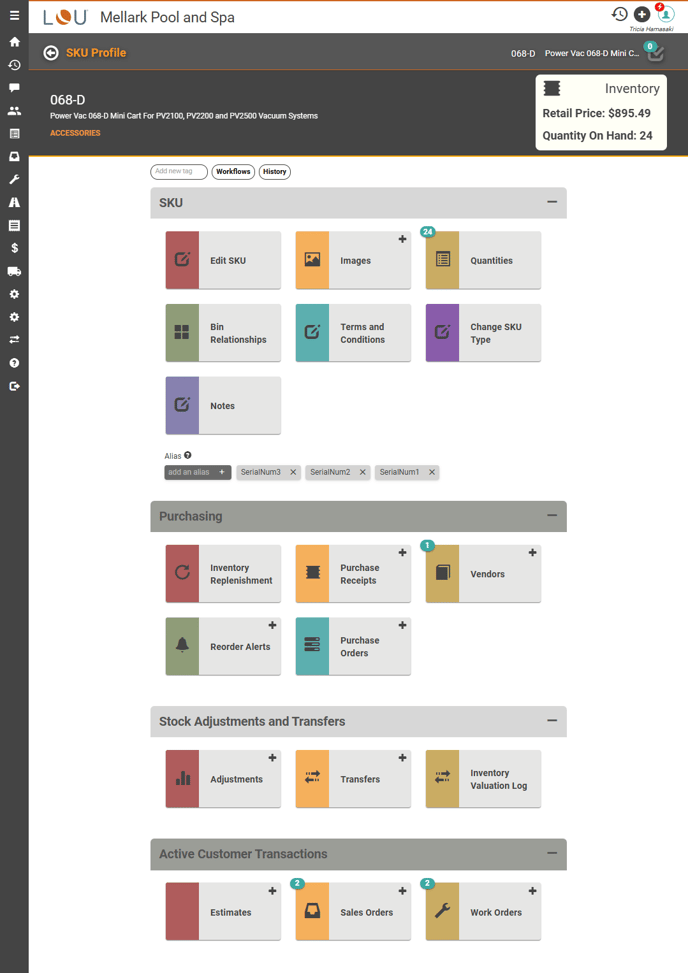 Some items you sell may have Serial Numbers that are used to identify the product and are necessary for tracking and receiving service, warranty claims, etc. Those items should have a Serialized SKU which links the SKU to the Serial Number, allowing LOU to track both. The SKU is a unique identifier of the group while the Serial Number is a unique identifier of the single product within the group.