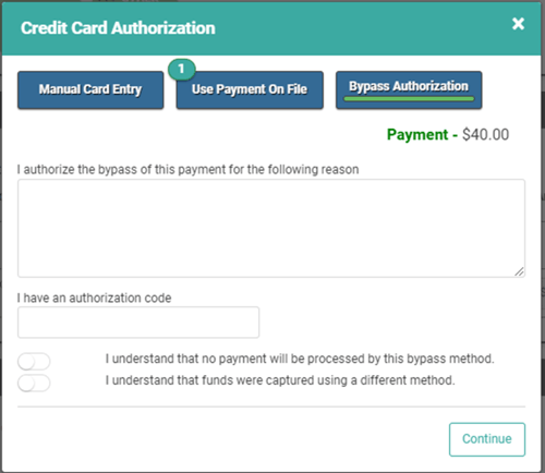 This screen allows you to enter a card for a one-time payment by completing the card details on the screen. It also allows you to select the Card(s) on file as a payment or use Bypass Authorization.