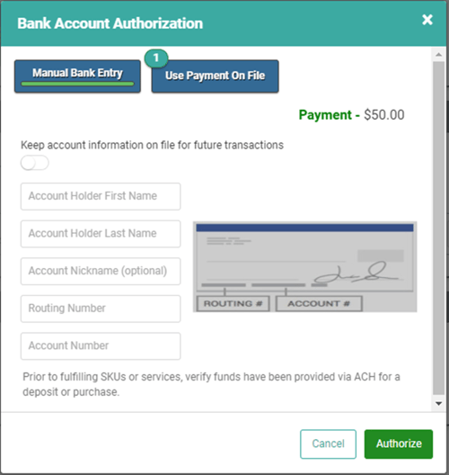 • Use Payment on File: Select one of the cards stored on file for the Customer by clicking Authorize.