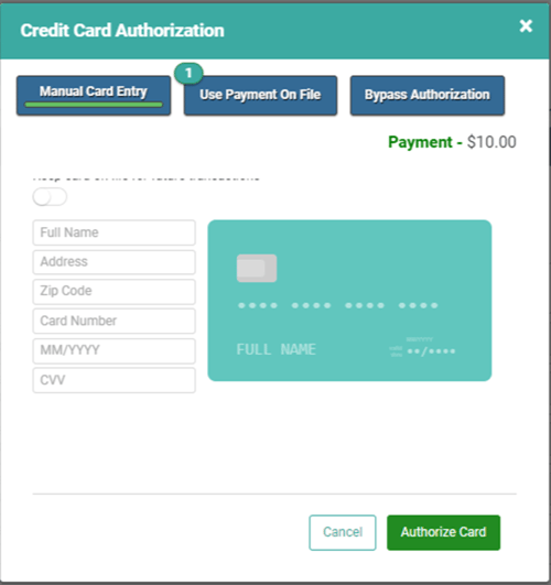 • Manual Card Entry: Enter the Full Name, Address, Zip Code, Card Number, and Expiration Date. If you want to store this information as Payment on File for future use, toggle on Keep card on file for future transactions.