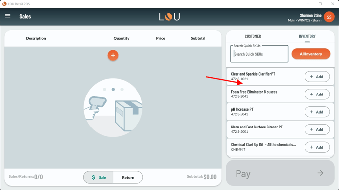 Tap the SKU to add to the Transaction. You can still search your Inventory for other SKUs and scan Cash and Carry items at the counter as you go.