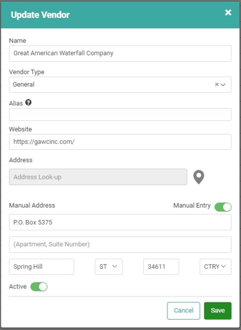 You can click Update to quickly change demographic information, including Name and Vendor Type, for the Vendor.