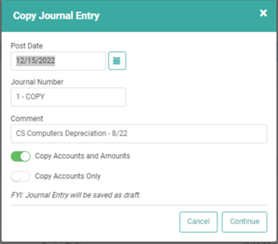 - Copy will create an exact duplicate of the Journal Entry in Drafts. A pop-up will allow you to determine the Post Date, Journal Number, and Comment for the copy as well as determine whether to Copy Accounts and Amounts or only the Accounts.