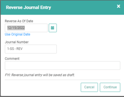 - Reverse will create a Journal Entry in Drafts which reverses the original Journal Entry. A pop-up will allow you to determine the Reversal Date, Journal Number, and Comment.