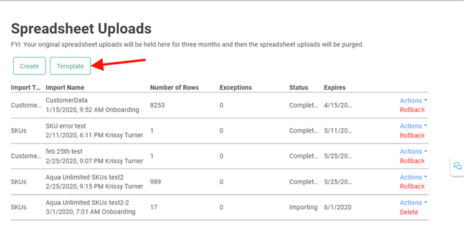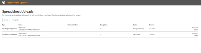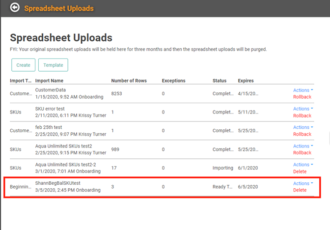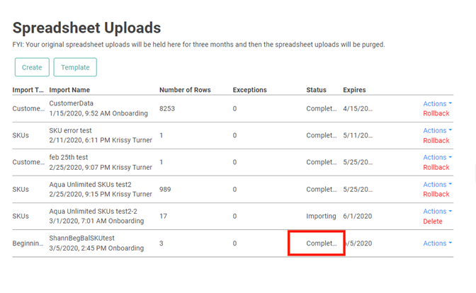 - Once you’ve confirmed what will be uploaded, and made any changes you want to make, you are ready to complete the import. Go back to the Spreadsheet Uploads page and click the Actions link next to the line item you want to upload.