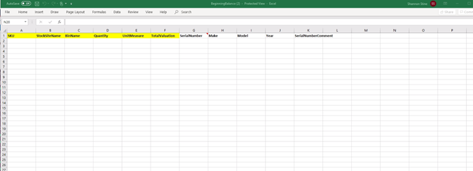 - SerialNumber**: This field is not highlighted because it is not required for non-serialized SKUs. However, if you are including Serialized SKUs in this import file, the Serial Number field is a required field.