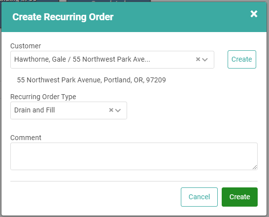 2. A new window will pop up, asking for the Customer, Recurring Order Type, and any comments you want to leave on the REO. TIP! If you realize the customer has not been created yet, you can use the  button next to the Customer dropdown to create the Customer right from this screen.
