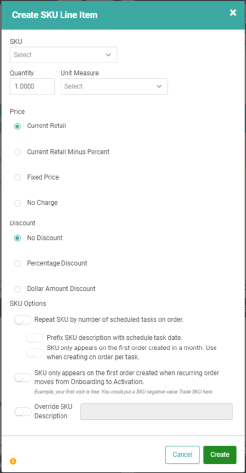 • SKU only appears on the first order created in a month. Use when creating an order per task: If you only want to charge the SKU once per month, but you’re creating a separate Order for each task, you should toggle this on. The SKU will appear on the first Order of the month, but not the remaining Orders, ensuring the Customer is only charged once for the SKU.
