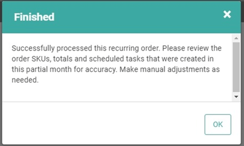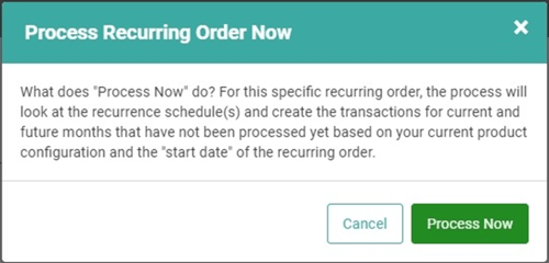 REOs default to processing via a batch process that runs on the 20th of the month and every day through the end of the month. This batch process creates the Orders for the following month. In situations where you want the Recurring Order you’ve activated to process immediately, instead of waiting for the 20th of the month, you can use the Process Now button. This will create an Order for the remainder of the current month as well as full Orders for the future month(s). You will receive a message letting you know what is about to happen.