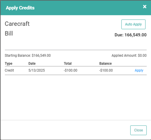 Once you’ve applied all the credits you can/want to, click close to return to the Pay Bills screen and finish processing the payment.