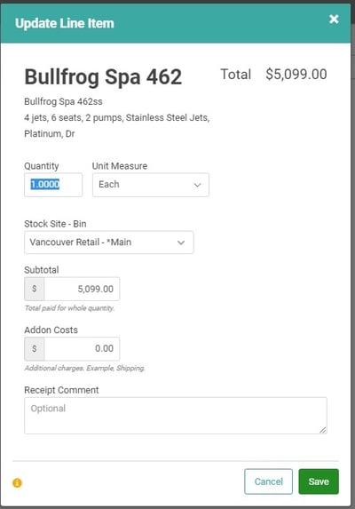 This pop-up is where you can add Add-On costs such as Vendor shipping charges you want to factor into the Cost and Sell Price. You can also add a note which will appear on your Purchase Receipt. Once you’ve made the additions/changes to the line item, click Save to return the Confirm Cost and Quantities page. Once you’ve made all the updates to each line item, click the