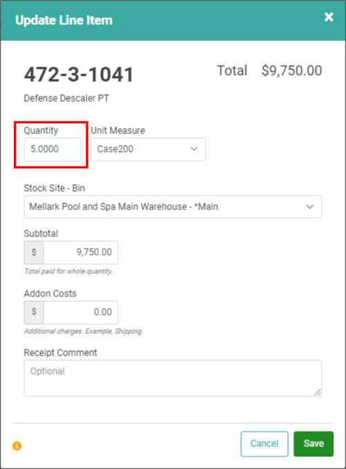 Once you’ve made the necessary changes, click Save. When you change the UOM in the Update Line Item window, you should see the Cost change automatically. As you click Save and return to the Confirm Cost and Quantities page, you should see the Cost and Quantity updated as well. Once you’ve made the updates, click Receive.