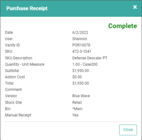 IMPORTANT! As a best practice, you should be creating Purchase Orders for all Inventory that is ordered and purchased through your Vendors. Manual Purchase Receipts should be reserved for extenuating circumstances where a typical purchasing scenario did not take place.
