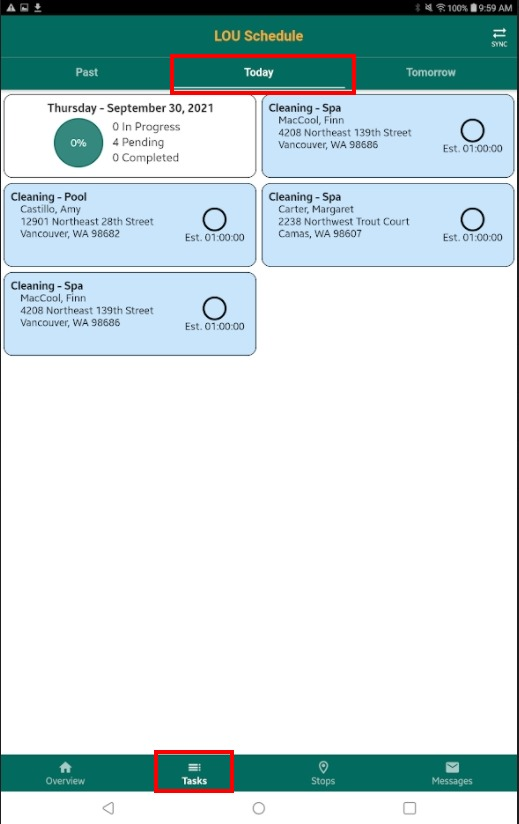 This page will show you all your Tasks on the Schedule for Today and a Summary of totals for the Day.