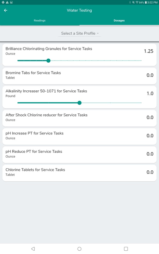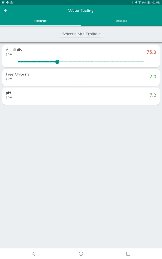 - Water Test: This is where you can enter your Water Test Readings and Dosages. Drag the slider to the correct value for each Reading. The readings will remain green when within normal ranges and will turn red when below or above normal range.