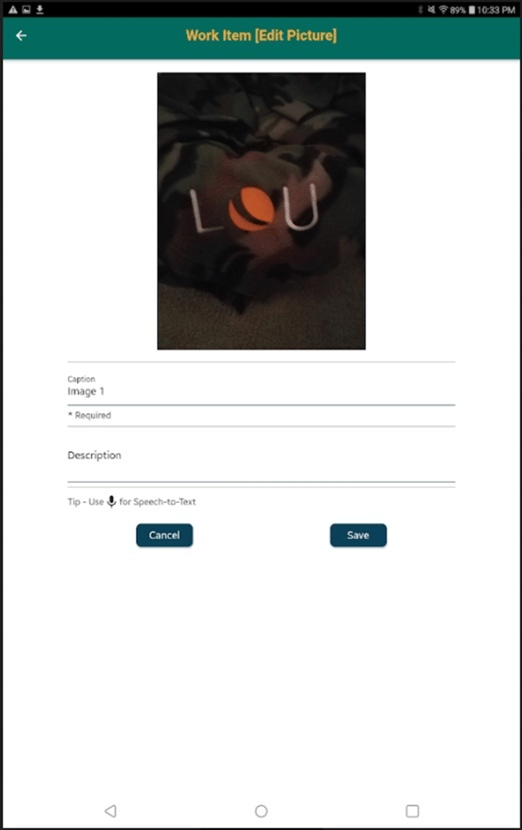 Tap Take Picture to open the camera and take a Picture. Then tap the Picture to change the Name and add a Description.