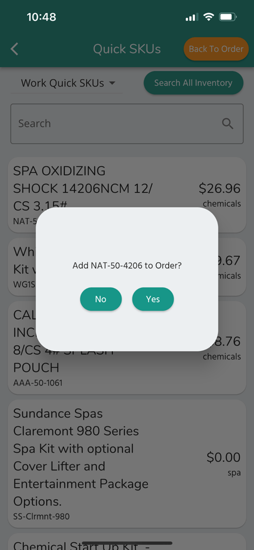 Tap a SKU and you will be asked to confirm you want to add the SKU to the Order.