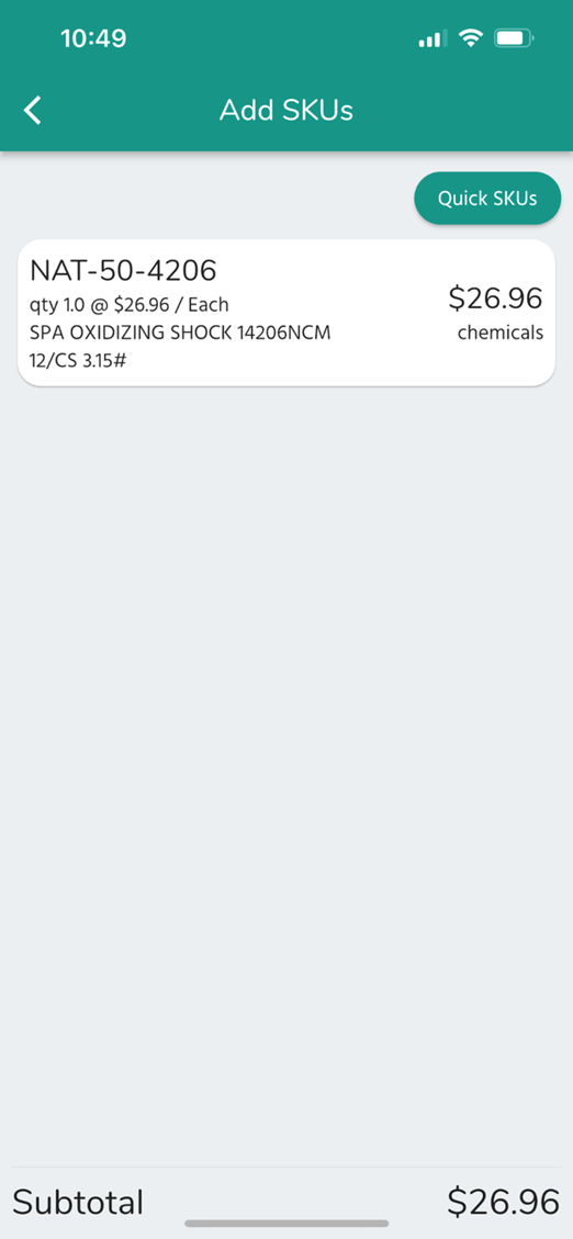 Tap Yes. The SKU will be added to the Order and you will be taken to a Subtotal page with the SKU you added listed. You can tap Quick SKUs or the back arrow to return.