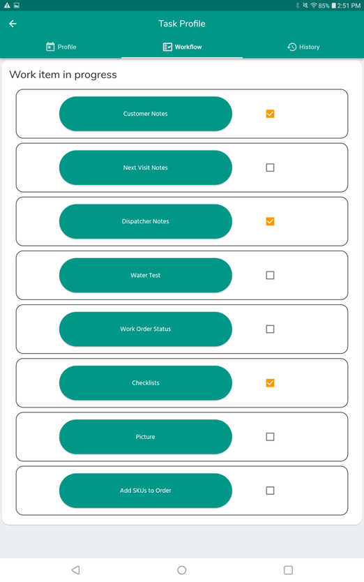 Workflow is where you can create Customer Notes, Next Visit Notes, Dispatch Notes, update the Work Order Status, answer Checklists, and take and view Pictures.