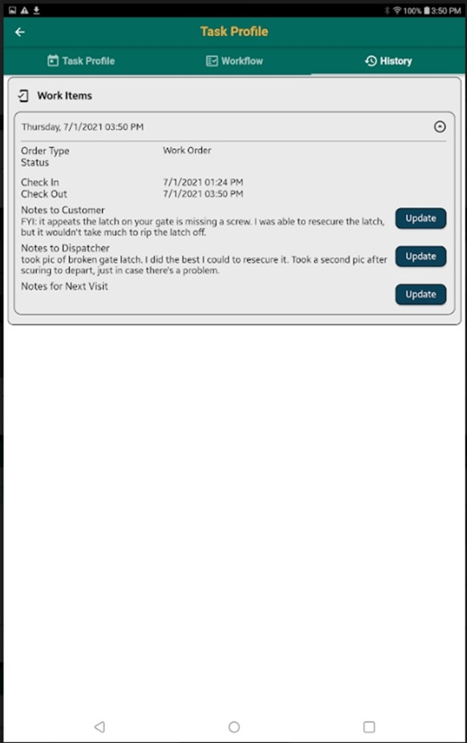 Once you’ve marked the Work Order as Complete and Checked Out of the Task, the History tab will be populated with a Summary of the Work Items. You can use the Update buttons to update the Notes items.