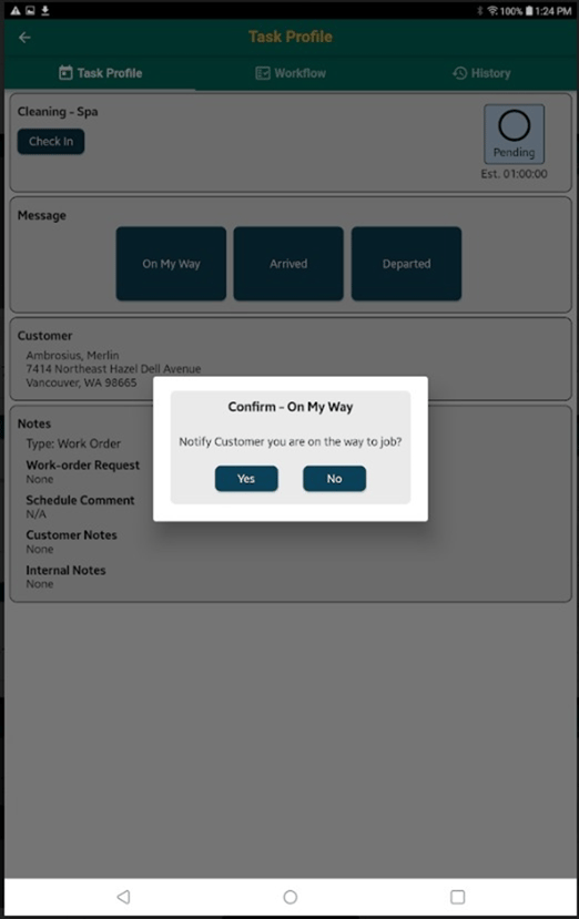 You will land on the Task Profile where you can Check In on the Task which starts the clock on the right. The estimated time for the Task is below the clock. You can quickly send the On My Way, Arrived, and Departed Messages to the Customer. The Customer Name and Address are there for reference. You can use the View Account button to view important information on the Customer’s Account.