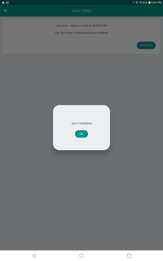 Tap Sync Now to sync data now. Once the sync is complete, you will get a confirmation message indicating the sync is complete. Tap OK to return to the Sync Page.
