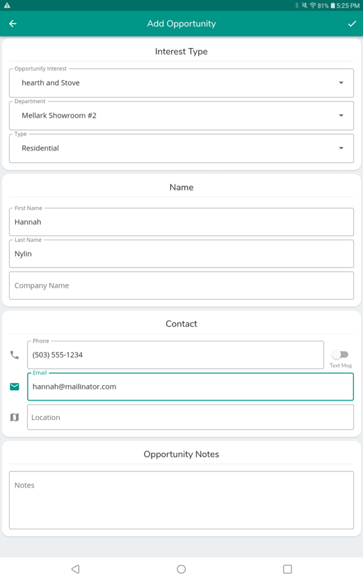 You can create Opportunities out in the field by tapping Add Opportunity. This allows you to take down contact information and their interest if someone is interested in products and services.