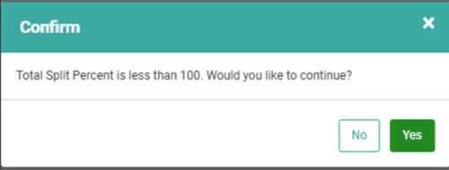 If the Split you create is less than 100%, you will get a warning message. You can click Yes to proceed. You must create additional Split requests to add up to 100%.