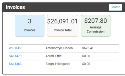 This box will give you details on the Invoices included in this Commission Run. The Top 3 Invoices by Commissions Total will display. To view the rest of the Invoices included in this Run, click Search.