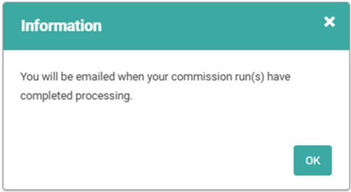 A message will pop up, letting you know that you will get an email when the Commission Run(s) have completed processing. You can click OK and continue working in LOU while this processes.