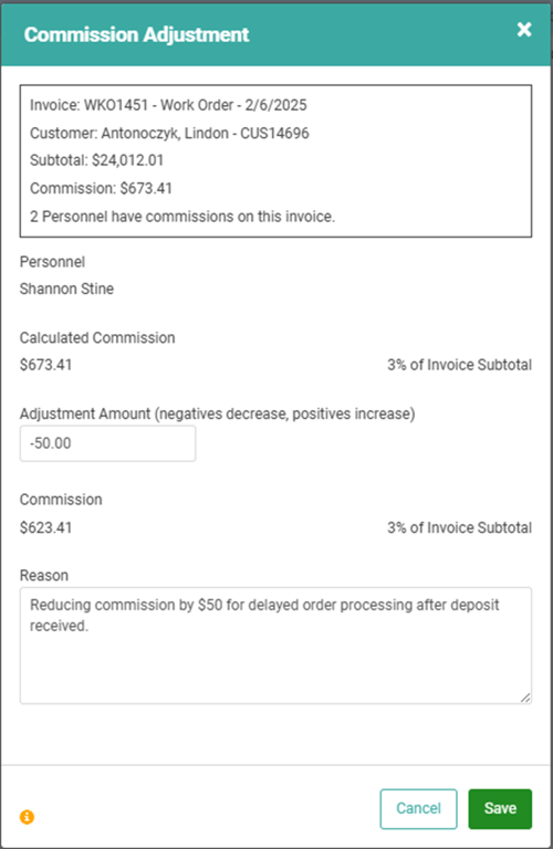 Once you click Save, the Adjustment will be reflected on the Adjustments tab and the Adjustments box on the main Commissions Run profile.