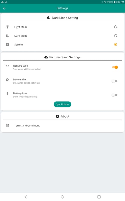 The Settings menu allows you to control several settings in the app. Dark Mode, Picture Sync Settings, and Terms and Conditions can be found in this page.