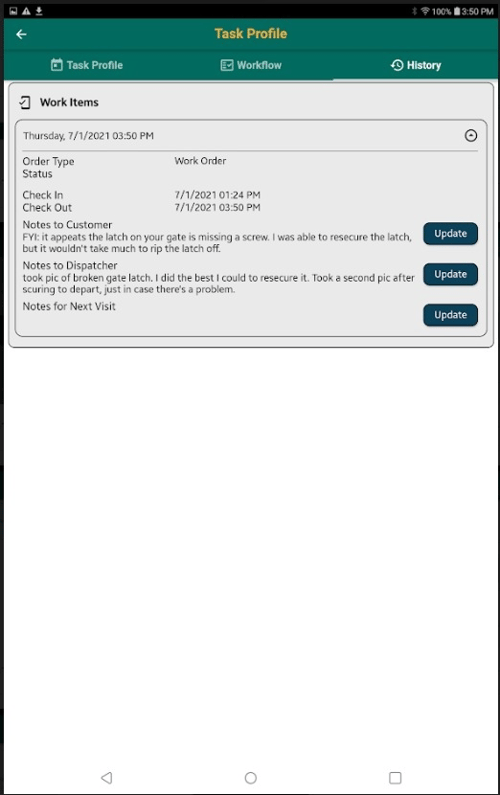 History Once you’ve marked the Work Order as Complete and Checked Out of the Task, the History tab will be populated with a Summary of the Work Items. You can use the Update buttons to update the Notes items.
