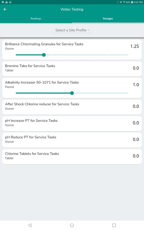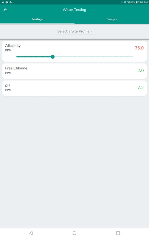 - Water Test: This is where you can enter your Water Test Readings and Dosages. Drag the slider to the correct value for each Reading. The readings will remain green when within normal ranges and will turn red when below or above normal range.