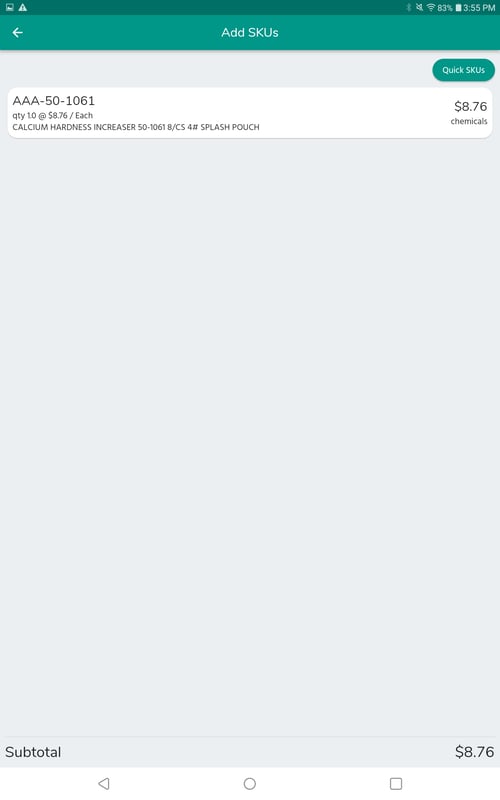Tap Yes. The SKU will be added to the Order and you will be taken to a Subtotal page with the SKU you added listed. You can tap Quick SKUs or the back arrow to return.
