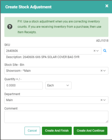 - The Create Stock Adjustment box will pop-up. The screen will default some information for you. The SKU, the Stock Site and Bin, and the Department. All this information can be changed, if necessary.