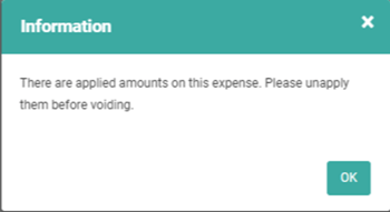 To Void a Complete Expense, you will follow the same process above except you will need to un-apply the Amounts first. If you click Void before un-applying the Amounts, you’ll get a warning message indicating that.