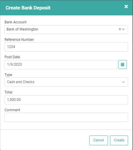 To create a new Bank Deposit, click the Create button. A pop-up will open, allowing you to complete the information.