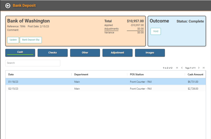You will return to the Bank Deposit profile. The POS Cash History will be listed on the page and reflected in the Applied Amount on the Deposit.