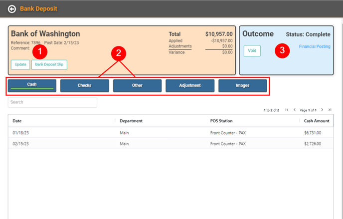 - Click each button to view the information included on the Bank Deposit for Cash, Check, Other, Adjustment, and Images.