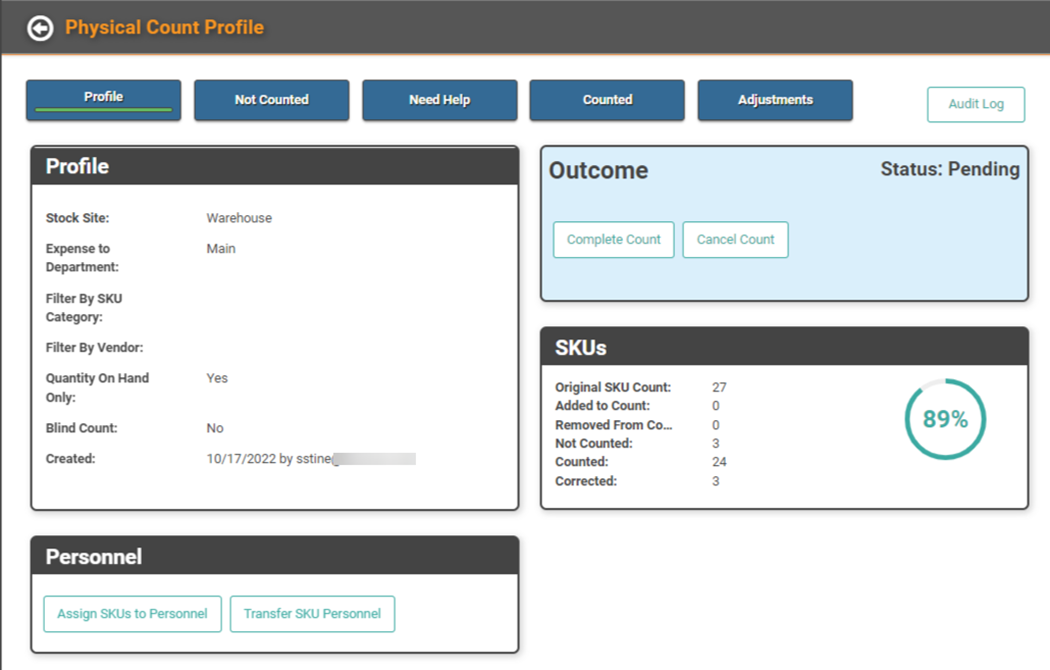This is the main page that gives you important information on the Physical Count and allows you to Assign SKUs to Personnel or Transfer SKU Personnel and access the Outcomes box to Complete or Cancel the Count.