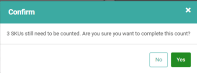 If there are SKUs you’ve left in Not Counted, LOU will give you a Confirmation Message when you click Complete Count, indicating how many SKUs still need to be counted and asking you to confirm you want to continue. If you’ve opted only to update SKUs with Adjustments needed for a non-blind count, this number will represent all SKUs on your list minus those you updated. As long as you are comfortable with the Counted Quantities remaining unchanged, you can click Yes to continue.
