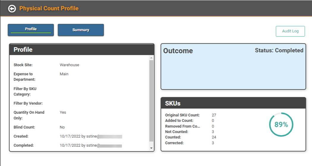 Once you’ve clicked Yes, the Profile page will update to display the Complete Status and information on who Completed the count.